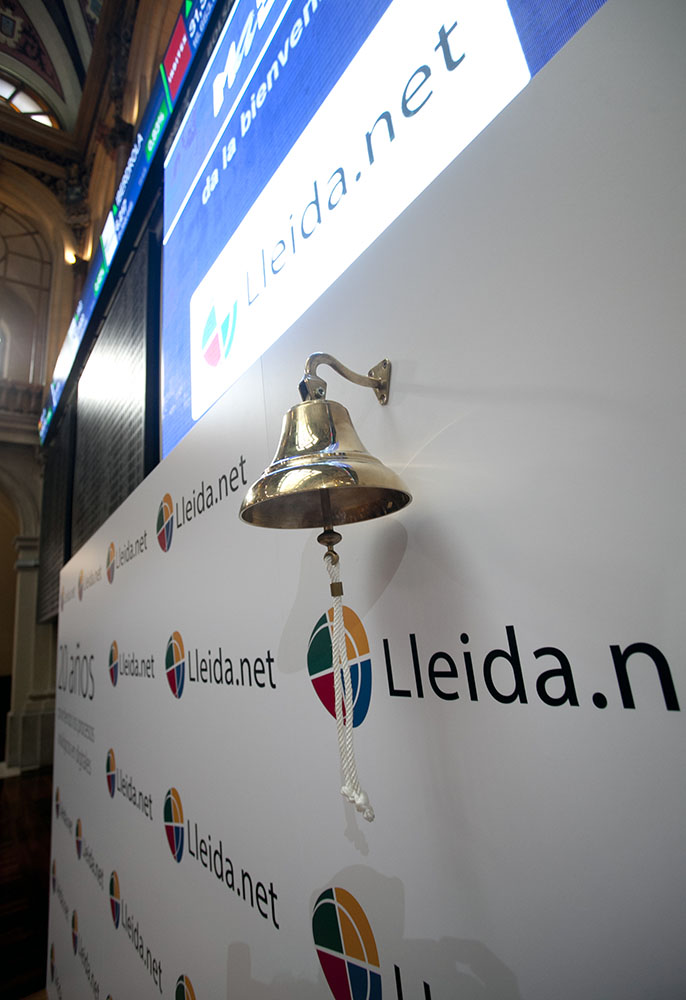 Le 9 octobre dernier, à 12 h, a eu lieu notre entrée au Marché boursier alternatif (MAB), simultanément à Madrid et à Barcelone. Sisco Sapena, fondateur et PDG de Lleida.net, s’est chargé de donner le coup de cloche qui a marqué le début de la cotation de l’entreprise au Palacio de la Bolsa à Madrid. Au même moment, à 600 km de distance, Marc Gallardo, avocat et conseiller de l’entreprise, donnait le coup de cloche à la Borsa de Barcelone.